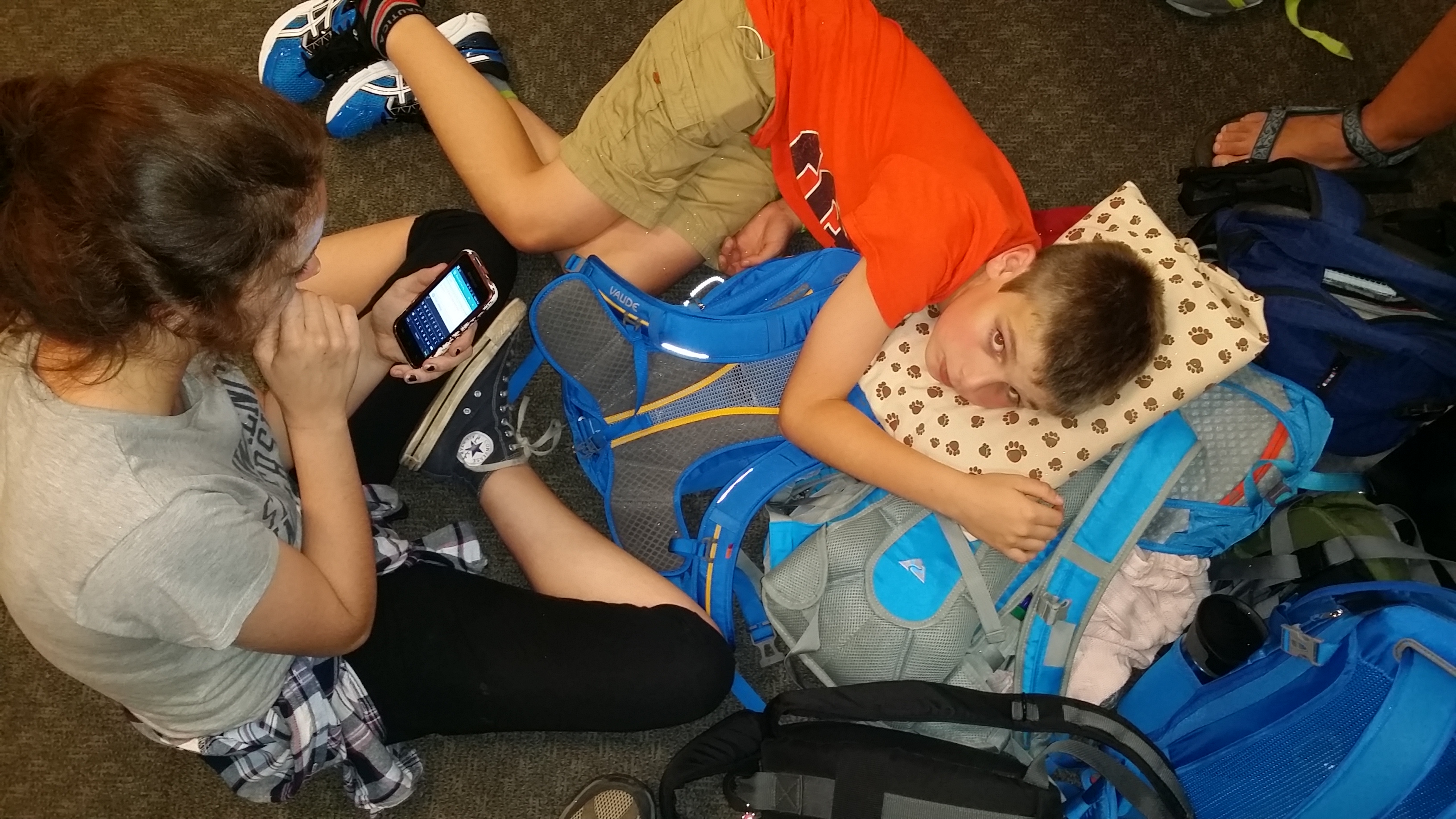 We had a couple hours of layover time, and then we got on the next plane. We were about to take off when there was a problem with the engine and everyone got off and came to a new gate with a new plane! Right now we’re all sitting in a heap with our carry on bags waiting to board.