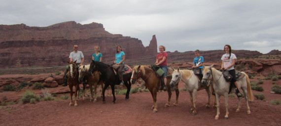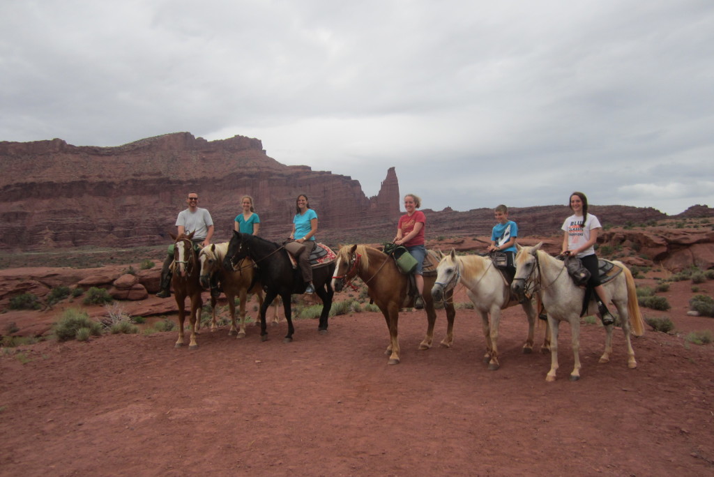We walked down to the stables/tacking area for the horses, and got on our horses. Our guides name was Trace, and I just realized that rhymes with Grace…Haha. Throughout the trail ride, Trace was telling us about all the different movies that were shot right where we were riding! For example, movies like City Slickers 2, John Carter, Rio Grande, and Comancheros. Of course I got stuck on the most stubborn, annoying horse. Her name was Jasmine so you would think she’d be all sweet, right? Wrong. Very wrong. Jasmine had this thing with the trail, and by that I mean it seemed she couldn’t physically stay on it!! She was always going in the general direction of the group, but far away from the trail! Jasmine also kept trying to rub me off, on all the trees and bushes, no matter how hard I tried to steer her away. We were going down a thin part of the trail, down a hill that was in the movie Comancheros. Jasmine pushed me into the bush and kept walking and i got a rip in my shirt, hair, and saddle bag! So that was a fun time. Here’s a photo that Trace took of us on the trail.