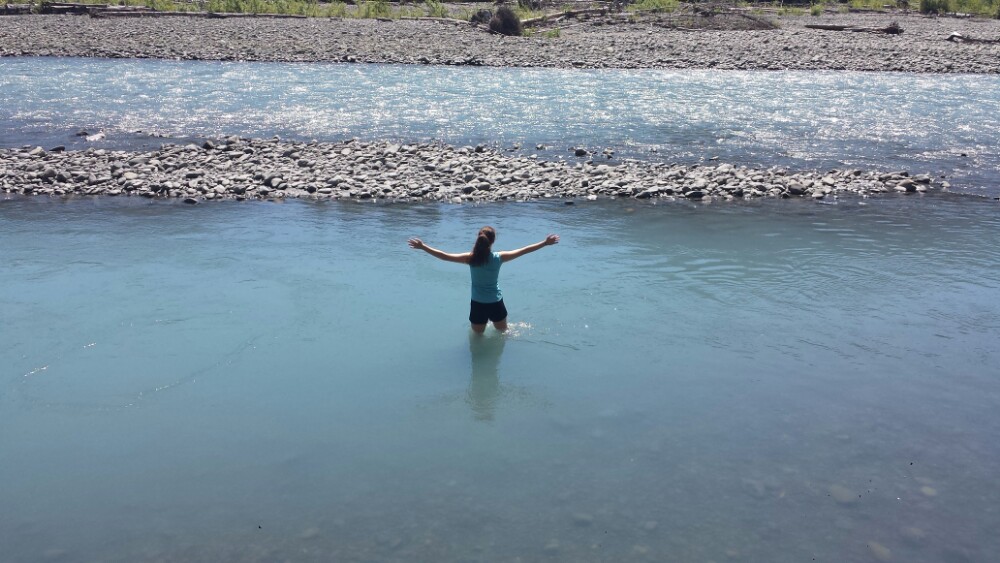 We hiked two different loop trails: the Hall of Mosses and the Spruce Trail. Halfway through the Spruce Trail, we came to a riverbank and we dipped our toes in. It was freezing, but Grace still went up to her knees.