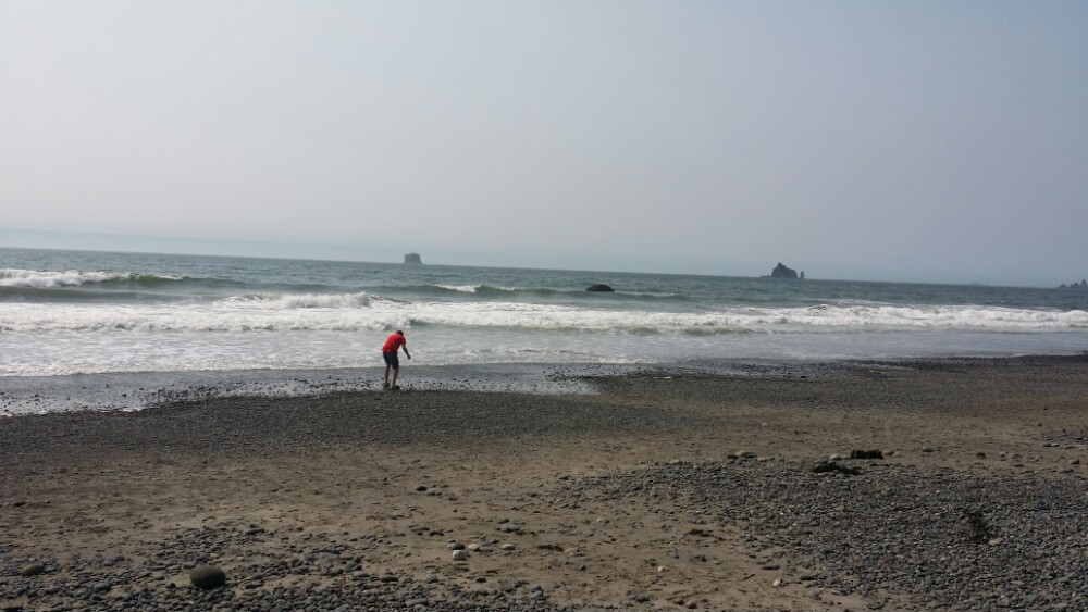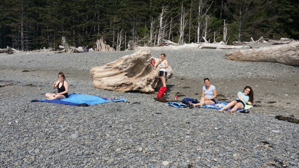 Back at the campsite, we got our swimsuits and towels and packed the car again to go to Rialto Beach. This beach was different from any other I have ever been to, because instead of sand, the ground was covered in smooth, grey rocks that were perfect for skipping. Huge pieces of driftwood that were actually logs formed a barrier between the parking lot and the beach, and since the wind was a little bit chilly, we used one as a barrier.