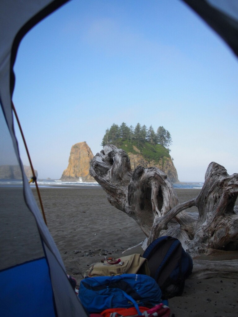 Then all of a sudden the fog rolled in and we couldn’t see more than 50 feet. The outcroppings that lay just offshore were completely hidden.  We packed up our gear and hiked back to the car — a little sad to leave our beach but also looking forward to seeing Rob and Cathleen in Seattle later that night.