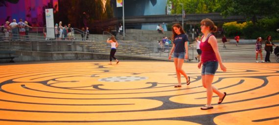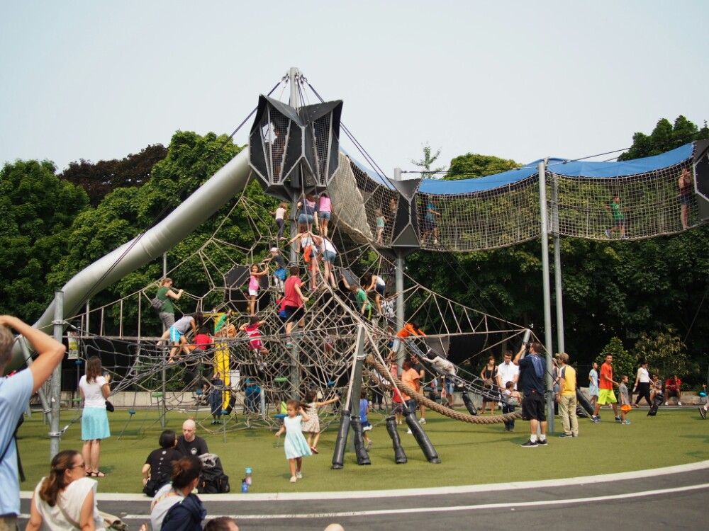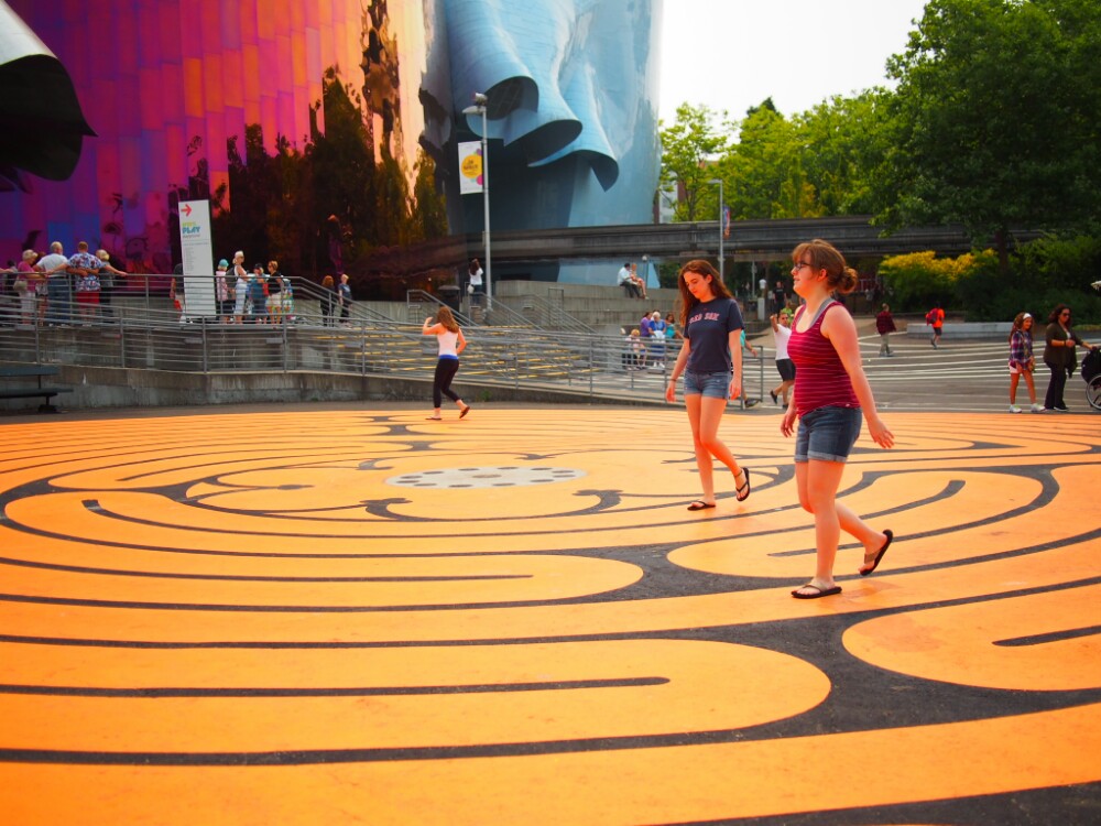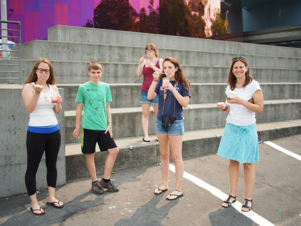 We had a 7 and a half hour drive ahead of us, but we wanted to stop at the Space Needle before we left Seattle. Once we got there and got tickets, we realized it would be over an hour before we could go up, so we walked around the little food trucks and stores in the area. Music was playing, and most of us got strawberry shortcake cups from a vendor. Next, we saw that there was a giant net-like climbing playground, so of course we had to climb it. The sign read that the park was for 5-12 year olds, but that did not stop us! I don’t think I’ll ever stop going on playgrounds.