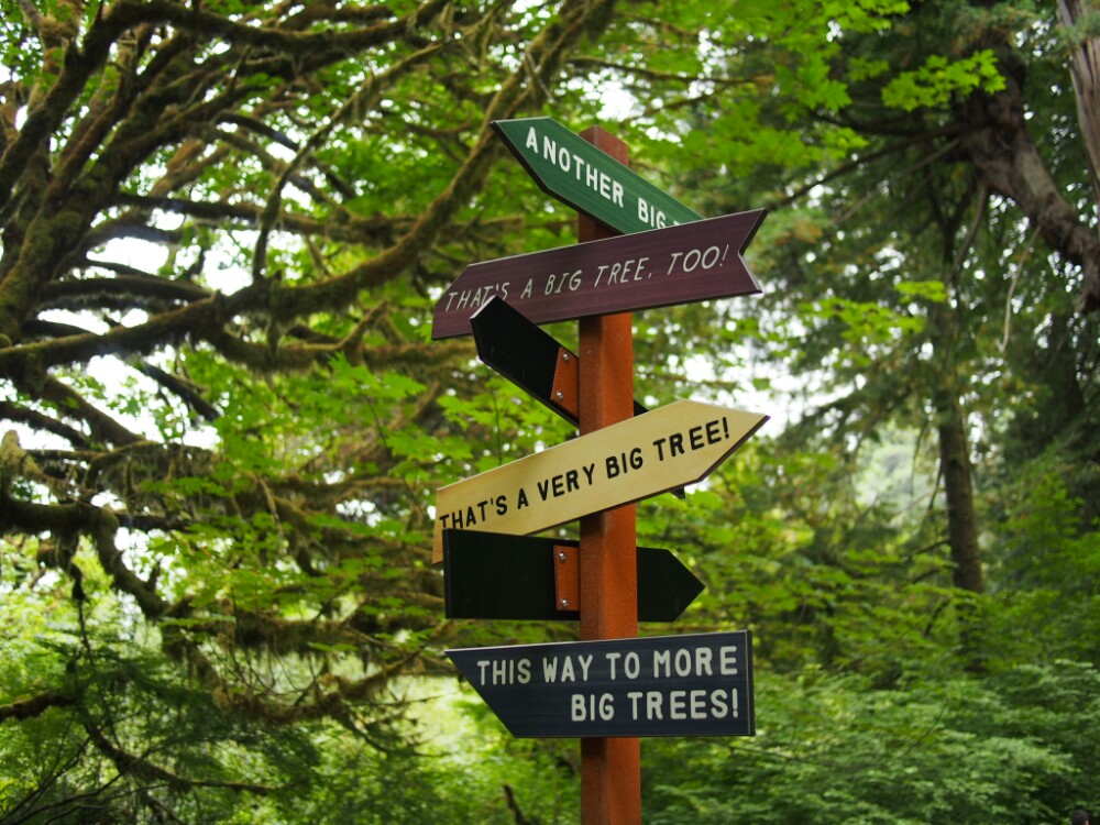 Our first hike was a .3 mile trail called the Moorman Pond Trail, but after we hiked it we christened it the Obstacle Course Trail. A little ways in the trail was blocked by branches that had fallen across the path, and a little ways further there was a giant log barring our way. There were were a couple different ways we used to get over this log: Noah preferred to run and jump, while Grace gave the tree a bear hug. Throughout the rest of our journey we came across several more obstacles and weird formations created by the trees, until we finally could go no further. We turned around and moved on to the next trail, which was called the Cathedral Trees Trail. Near the trailhead was a tree called Big Tree. It was indeed a big tree, but it was not the biggest tree that we had seen in the park. A sign nearby pointed out the Big tree, and also pointed to “Bigger Trees” and “Another Big Tree”.