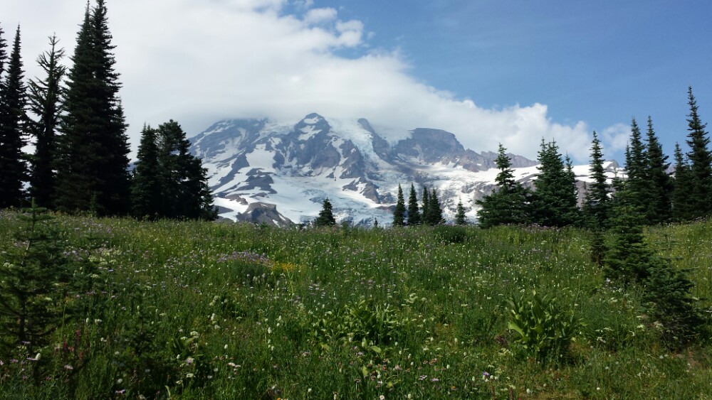 We drove north from our hotel and reached Mount Rainier National Park in the afternoon. We decided to explore a little before setting up camp. We were scanning the skies for our first sight of the mountain. When we finally did spot the snow-covered peak, it was in amazing site.